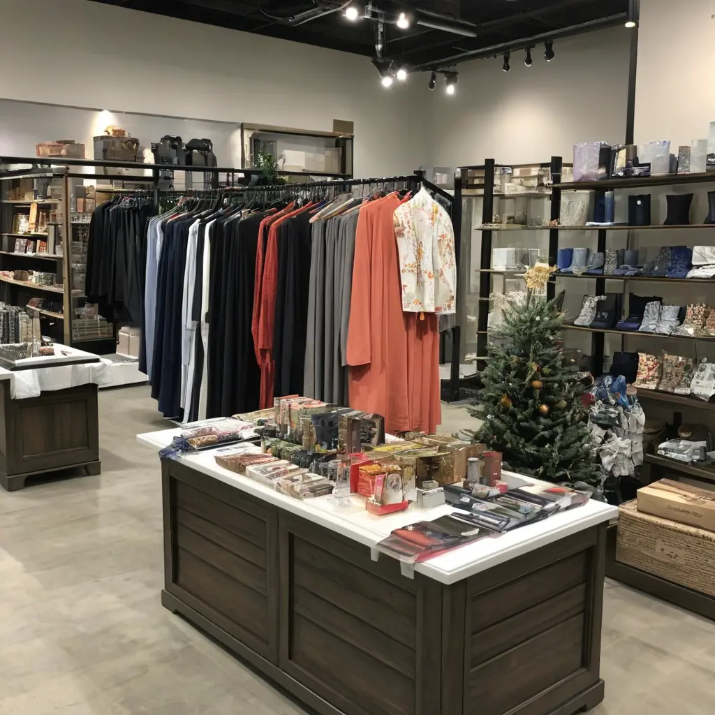 - Центральный стол в магазине оформлен под текущую коллекцию, товары расположены по сценарию использования (комната — уют — подарок).